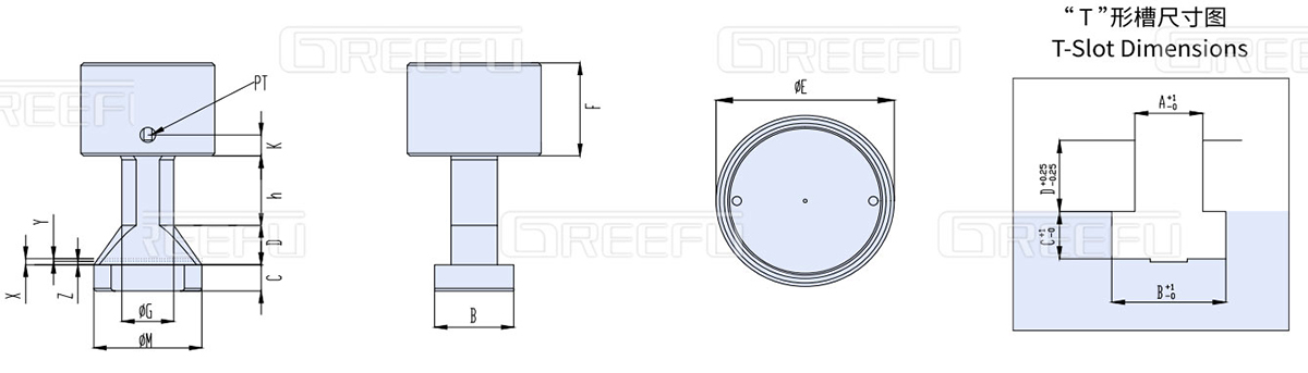3. 訂貨時請標(biāo)明 T形槽尺寸 A B C D 尺寸及模具夾持部位厚度(H)尺寸;